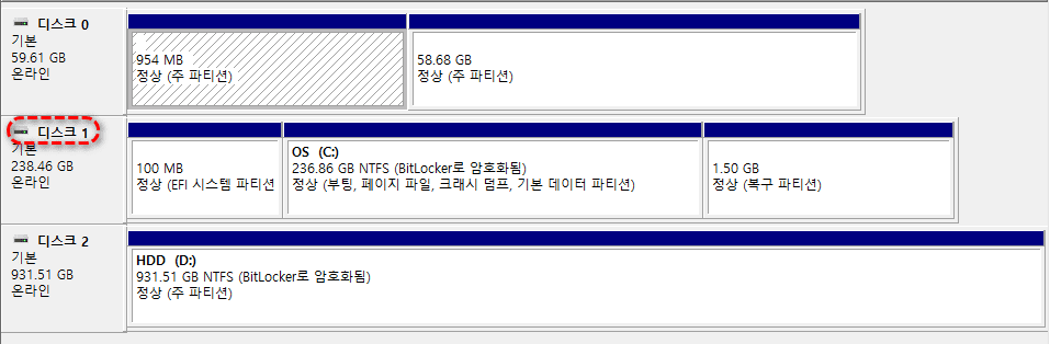 이때 disk 1이 Gpt에 *가 있다면 GPT, 없다면 MBR 파티셔닝 방식입니다.